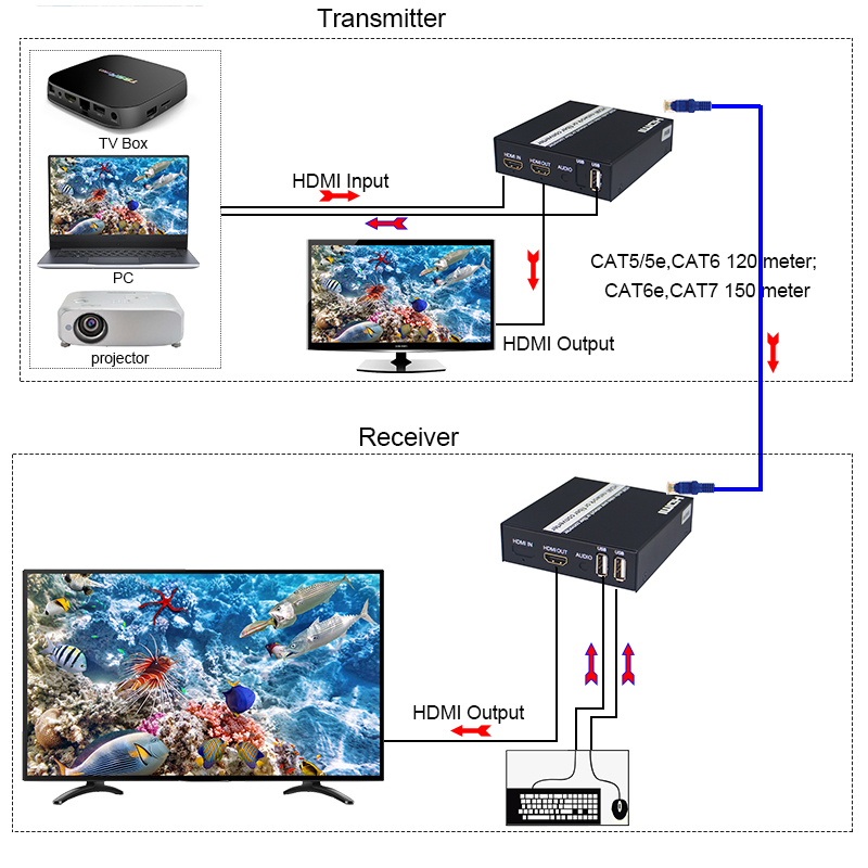 Hdmi extender + usb with hdmi LoopOut ขยายสัญญาณ HDMI 1080P ได้ถึง 120m ผ่านสายแลนเส้นเดียว