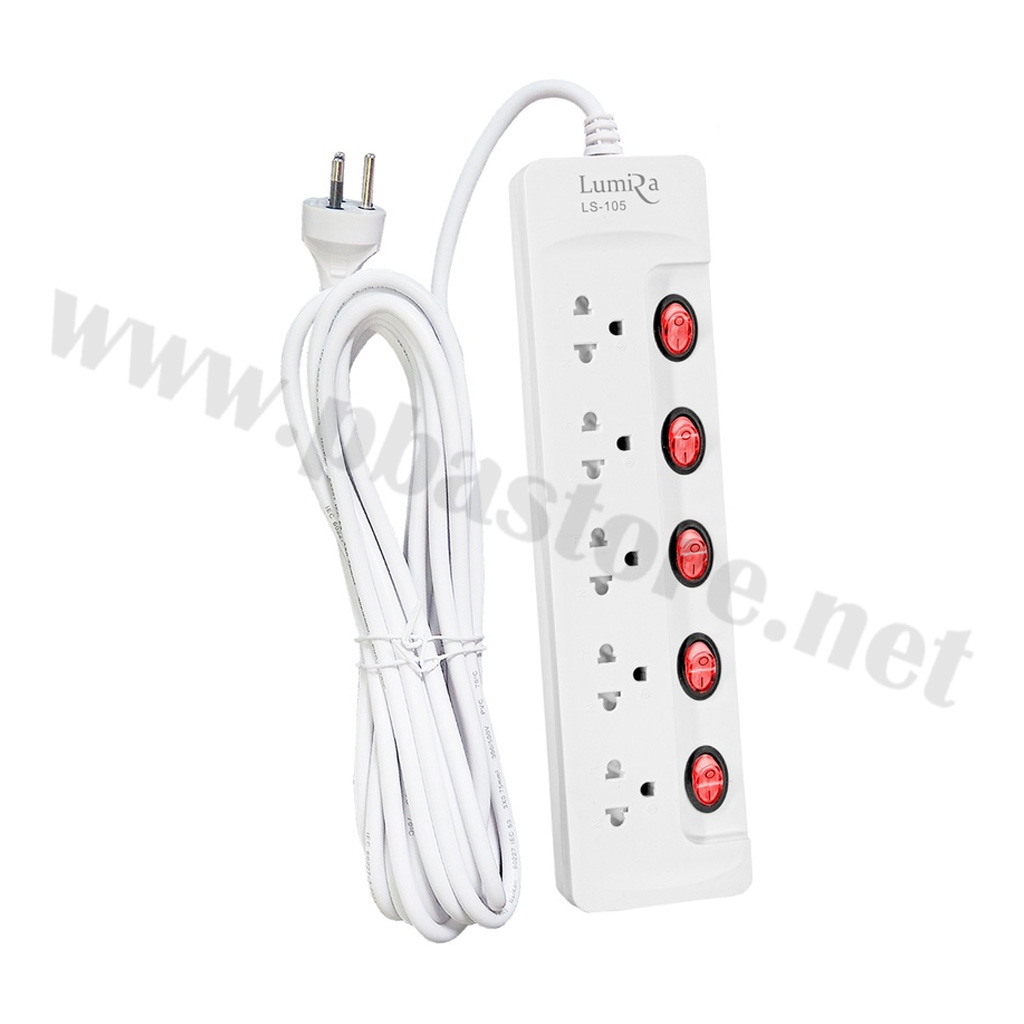 ปลั๊กไฟ 5 ช่อง มีสวิตช์เปิดปิดทุกช่อง สายยาว 3 เมตร สีขาว LUMIRA รุ่น LS-105 3M (มี มอก.)มาพร้อมช่องเสียบ 5 ช่อง พร้อมสวิตช์ควบคุมแยกอิสระแต่ละช่อง