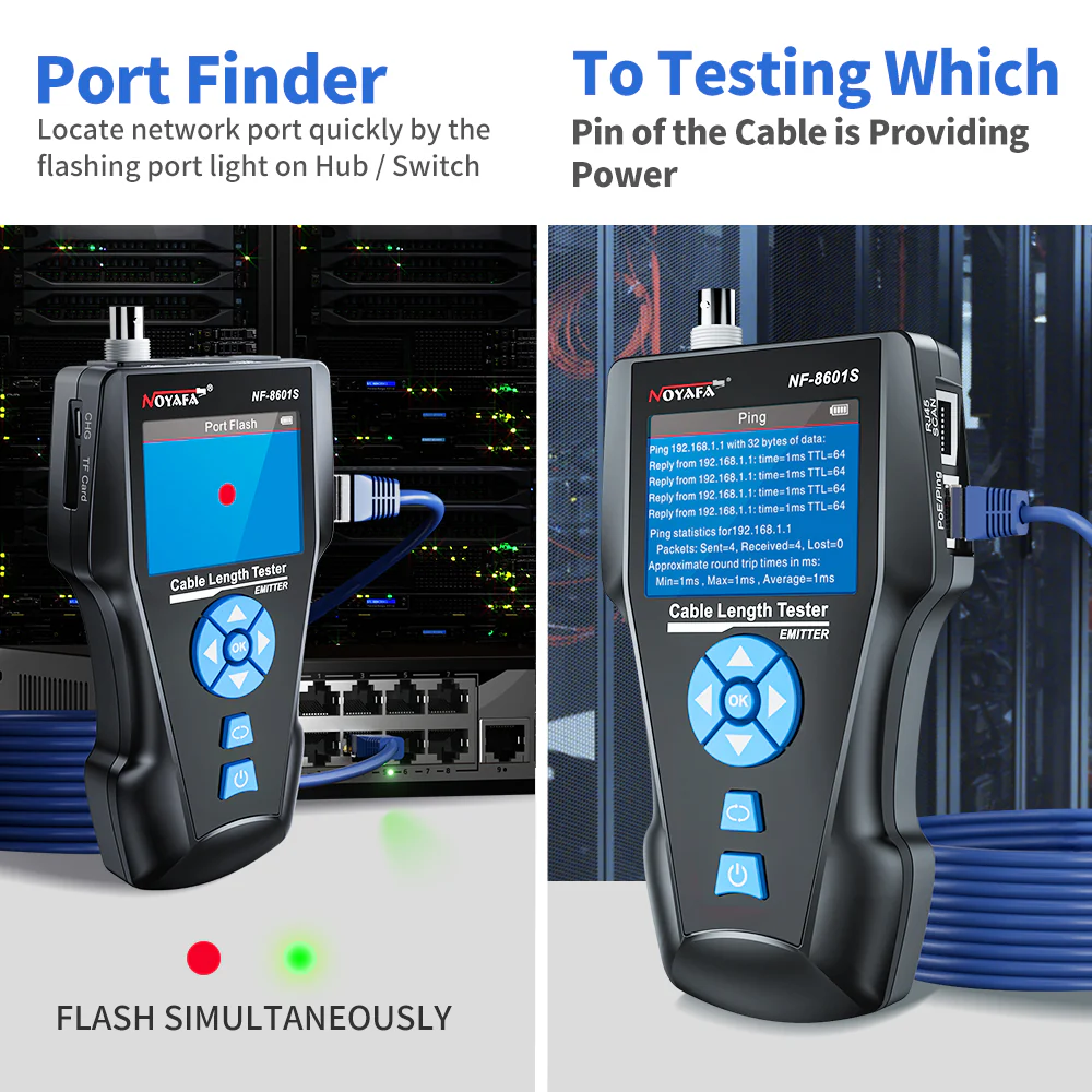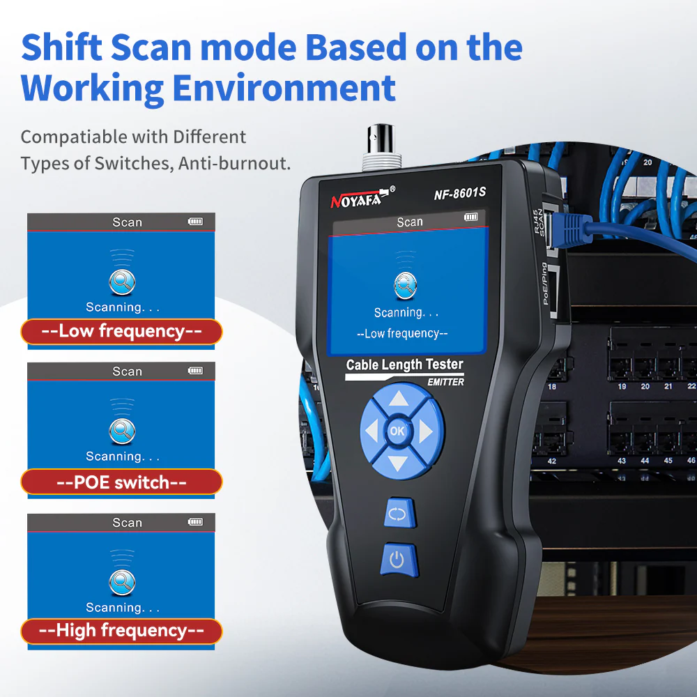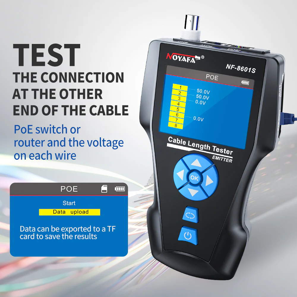 TESTER สายสัญญาณ LAN/Phone/POE/RG6 NOYAFA รุ่น NF-8601S เป็นเครื่องทดสอบสายสัญญาณแบบพกพาที่ออกแบบมาเพื่อตรวจสอบสาย LAN, โทรศัพท์ (Phone), POE และสาย RG6 ได้อย่างสะดวก รวดเร็ว และแม่นยำ
