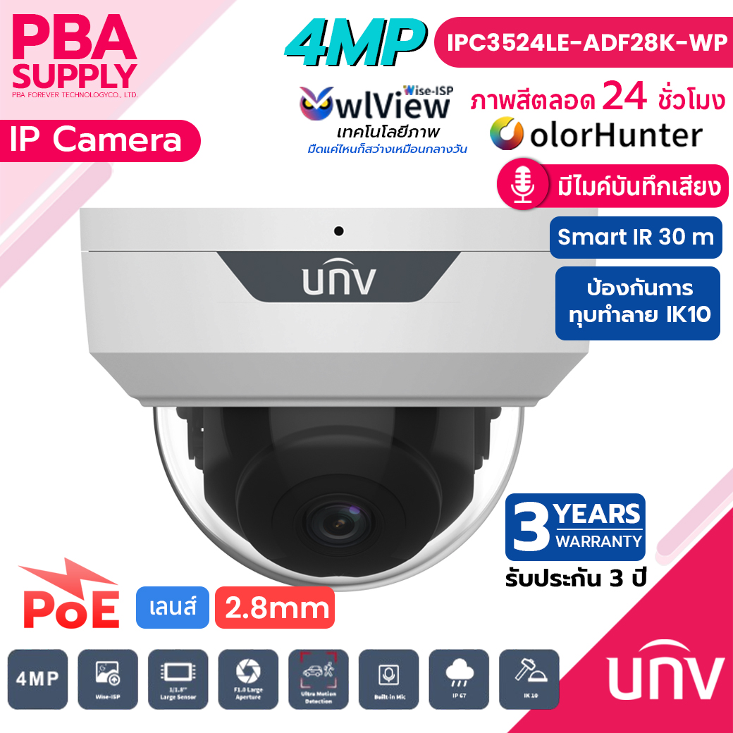 กล้องวงจรปิด 4MP ColorHunter Wise-ISP Fixed Dome Network Camera UNIVIEW รุ่น IPC3524LE-ADF28K-WP เป็นกล้อง IP Dome ความละเอียด 4MP ที่มาพร้อมเทคโนโลยี ColorHunter และ Wise-ISP ให้ภาพสีคมชัดตลอด 24 ชั่วโมง แม้ในสภาพแสงน้อย