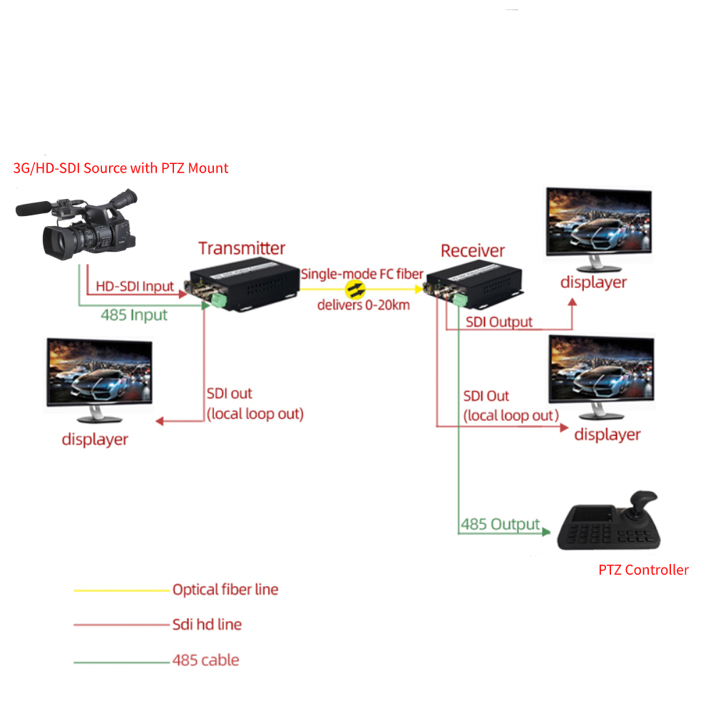 3G-SDI to Fiber Converter 1CH เป็นเครื่องส่งและรับสัญญาณวิดีโอและเสียง รองรับรูปแบบสัญญาณ SD-SDI/HD-SDI/3G-SDI