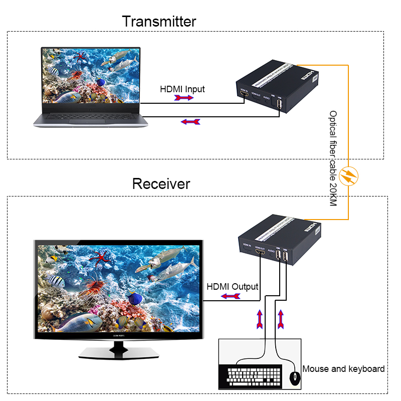 HDMI TO Fiber+USB Single Mode 20KM (Port SC) อุปกรณ์ส่งสัญญาณภาพระยะไกลด้วยสาย Fiber Optic ระยะ 20 กิโลเมตร