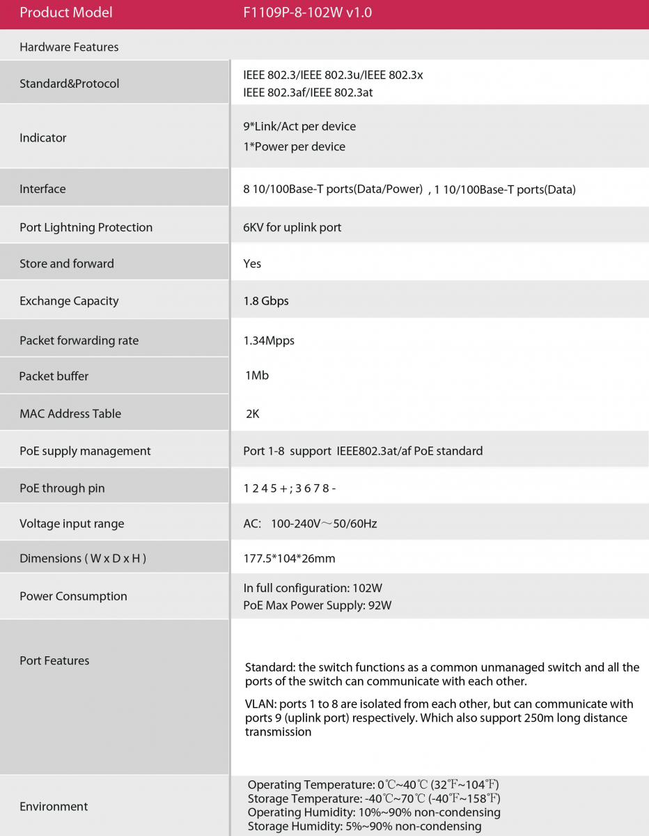• Supports MAC address self-learning and auto MDI/MDIX
