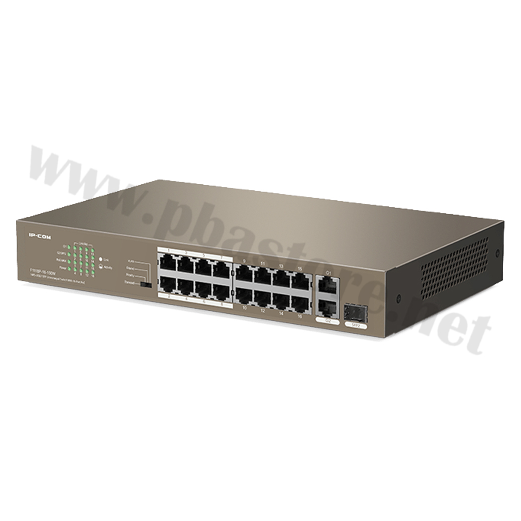 IP-COM F1118P-16-150W POE Switch 16 Port ความเร็ว 100Mbps พร้อม 1 Port GIgabit Uplink/ SFP, จ่ายไฟ POE 802.3af/at ทั้ง 16 Port รวม 135W รองรับการเดินสาย Lan สูงสุด 250เมตร @10Mbps