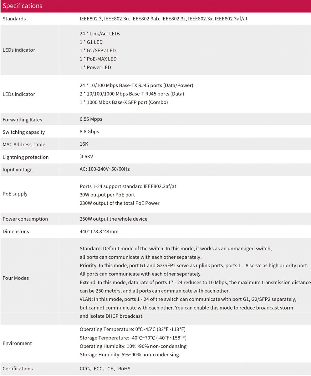 - Compliant with IEEE802.3, IEEE802.3u, IEEE802.3ab, IEEE802.3z, IEEE802.3x and IEEE802.3af/at standards.