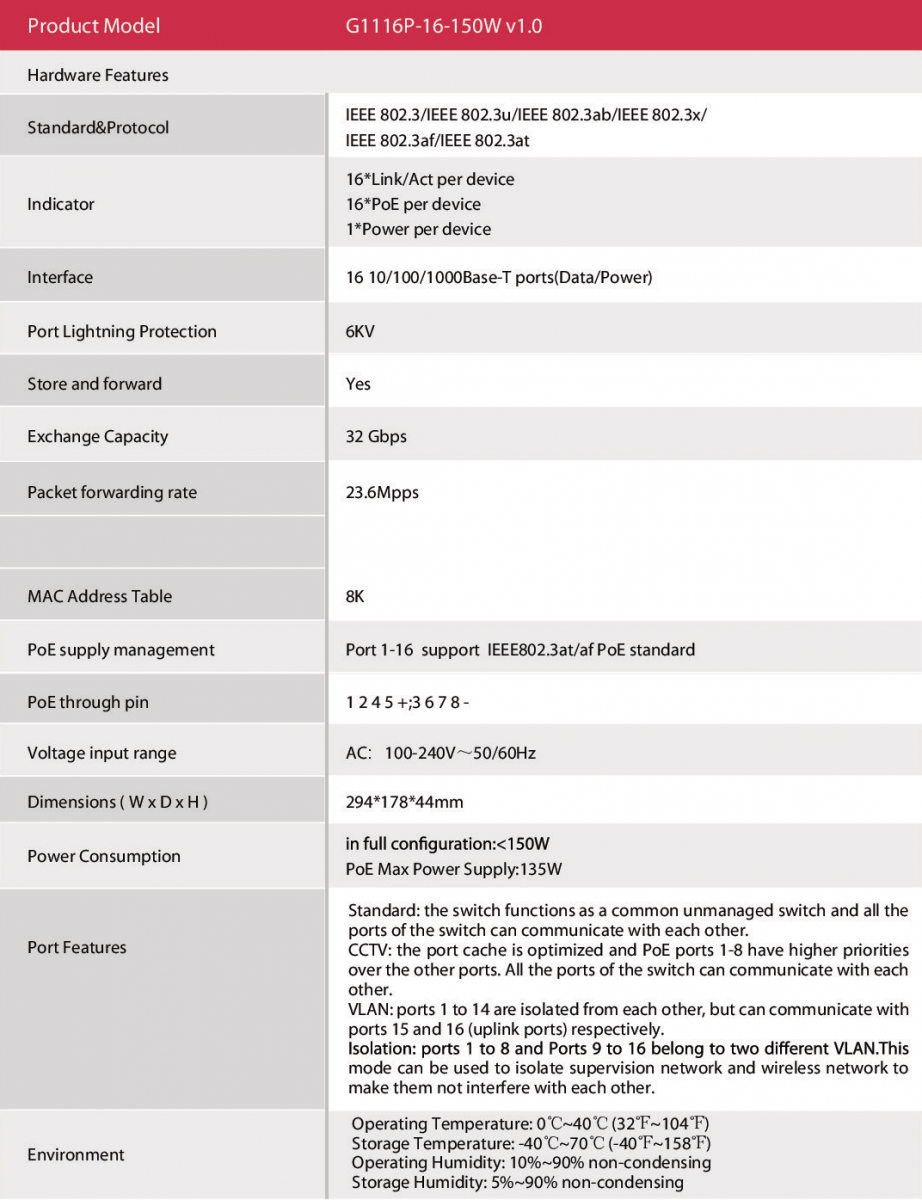 - Provide 16 10/100/1000Mbps auto-negotiation ports with 16-port PoE