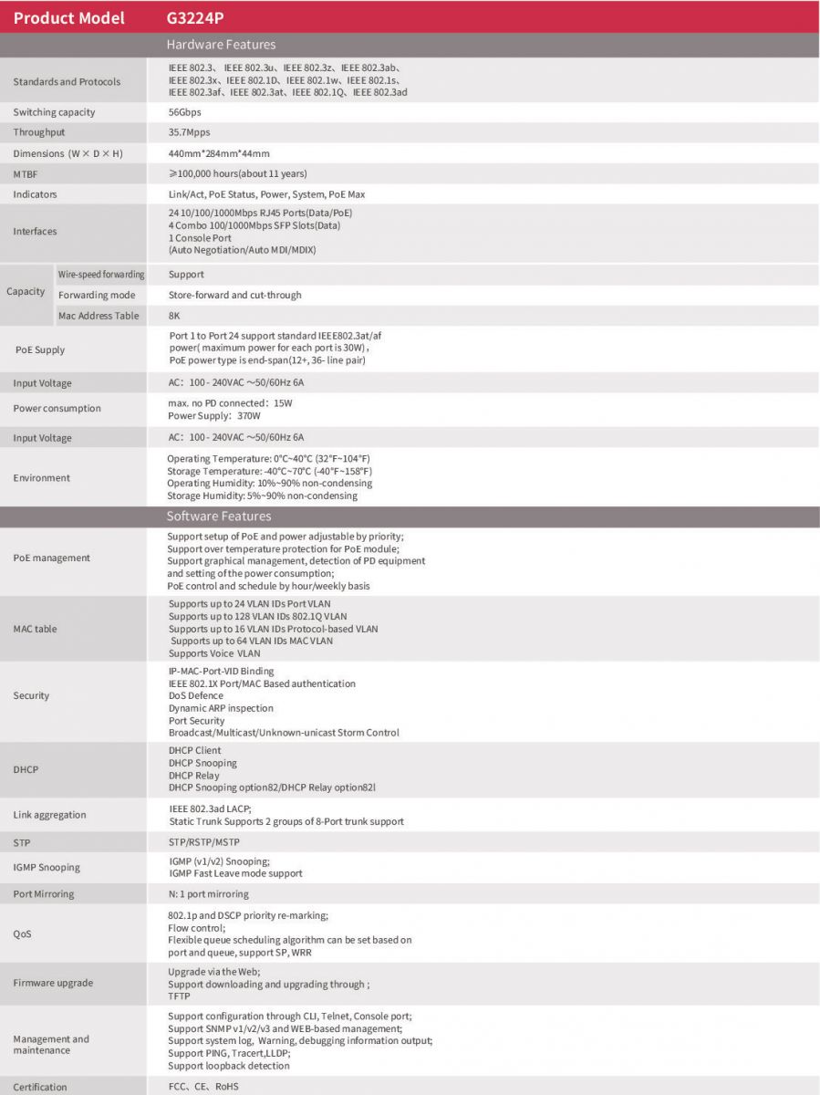 IP-COM G3224P L2-Managed Gigabit POE Switch แบบ Rackmount ขนาด 24Port 10/100/1000Mbps, 4 Port SFP จ่ายไฟ POE มาตรฐาน 802.3af/at 24Port จ่ายไฟสูงสุด 370W
