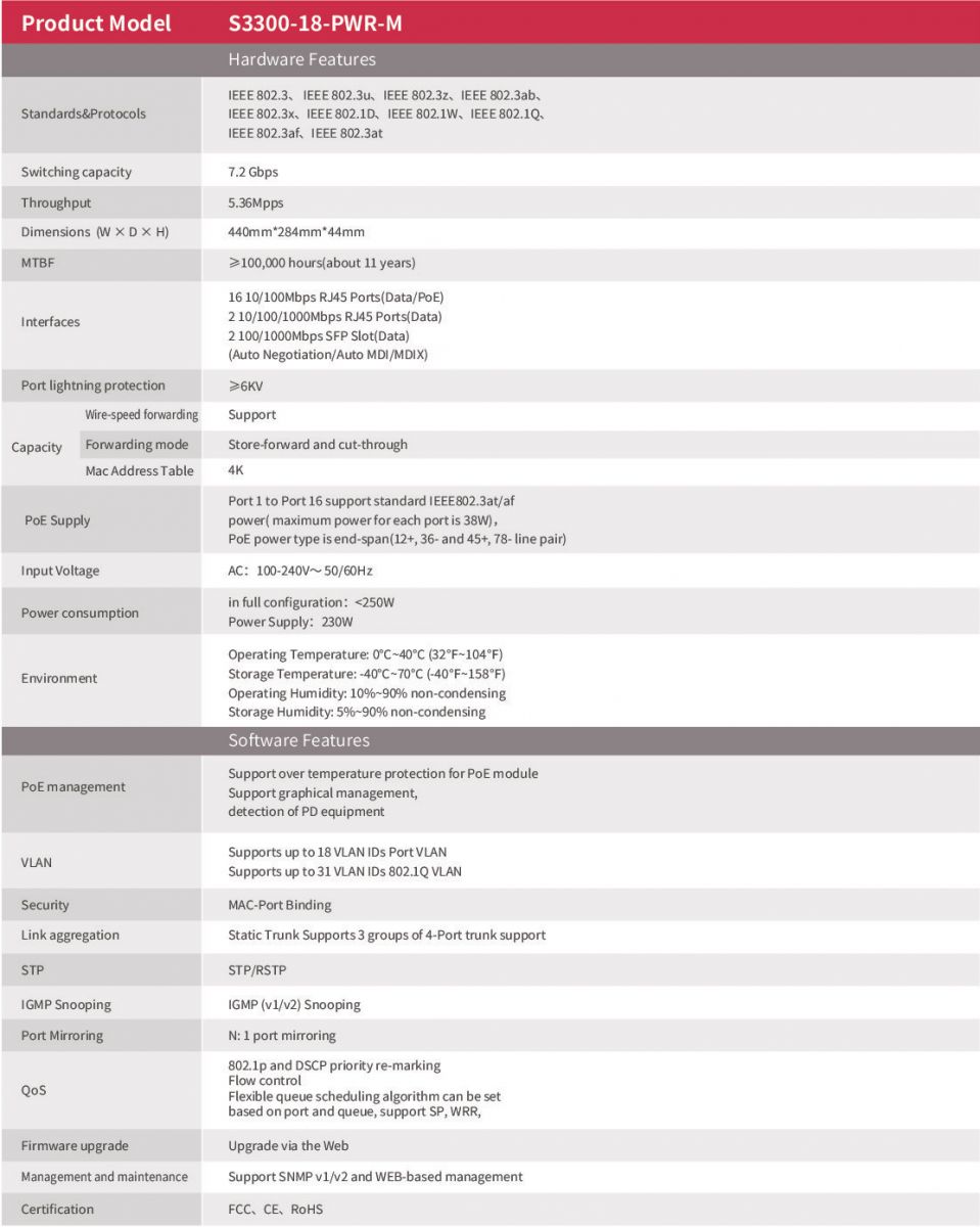 - 16 10/100Base-TX RJ45 ports support PoE power supply. The total power output is up to 230W and the maximum output of a single port is 40W.