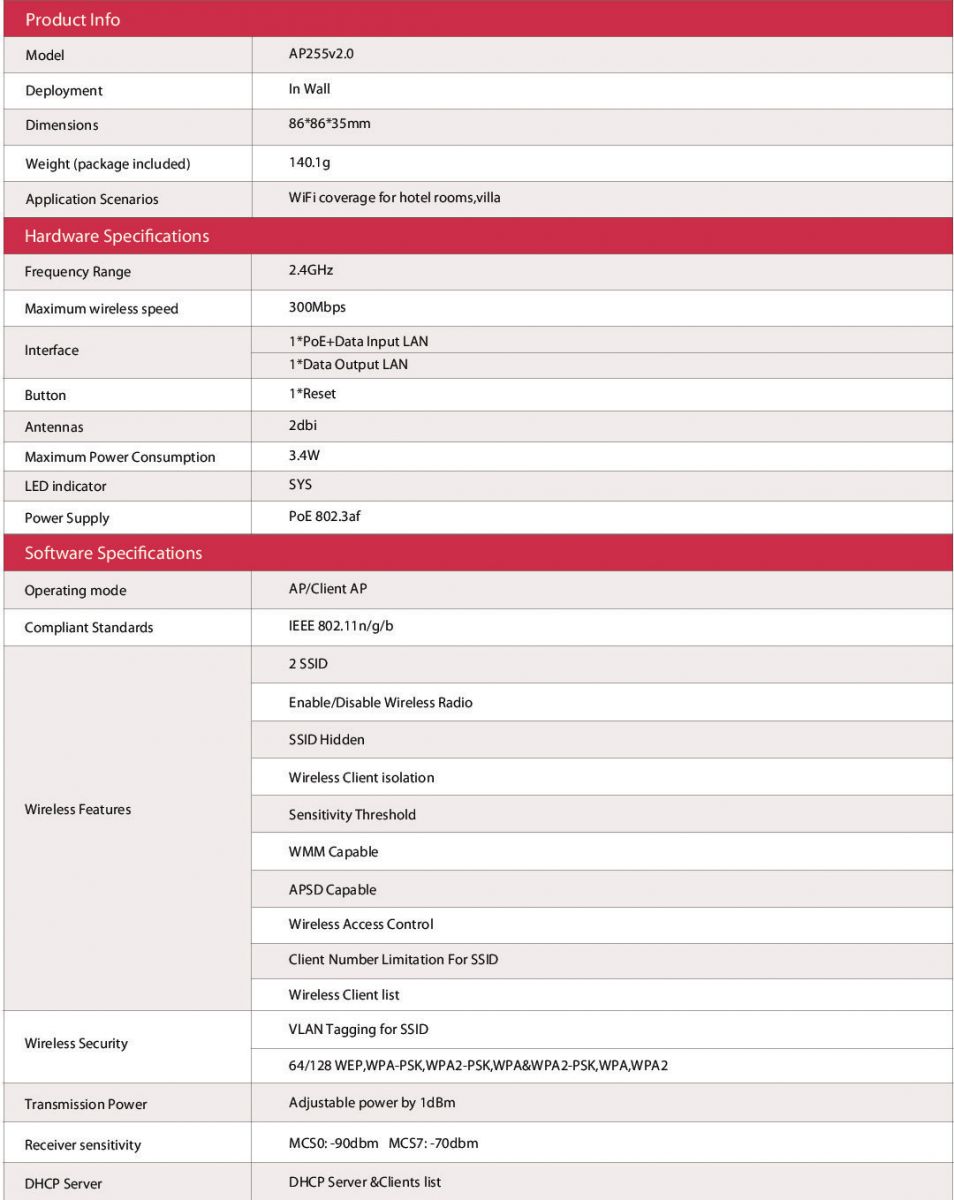 IP-COM AP255 300Mbps Wireless In-wall Access Point 2.4GHz 11n 300Mbps 10/100Mbps LAN