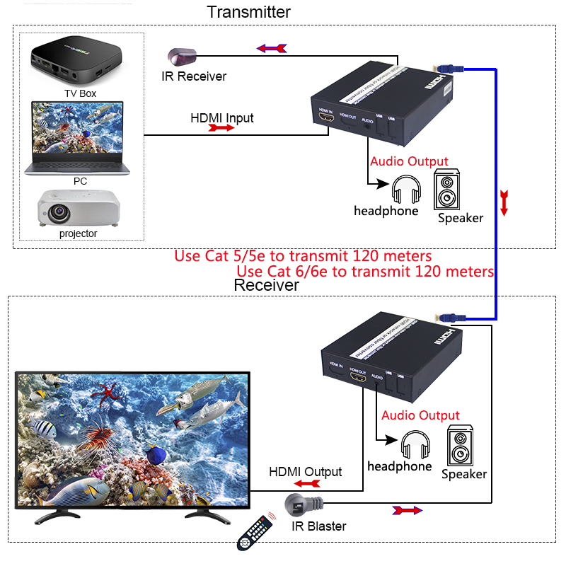 HDMI + IR extender transmits 120 meters via CAT5 / 5e, 150 meters via CAT6 / 6e, 1080P @ 60Hz, Supports one transmitter to multiple receivers Interface:TX: HDMI Input, IR Interface,Audio Output,RJ45; RX: HDMI Output ,IR Interface,Audio Ouput,RJ45
