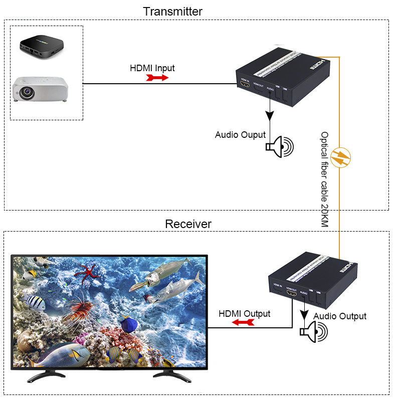 HDMI over fiber converter,SM 20KM, SC/UPC,1080P @ 60Hz Interface:TX: HDMI Input, Audio Output,SC OPT; RX: HDMI Output ,Audio Output,SC OPT