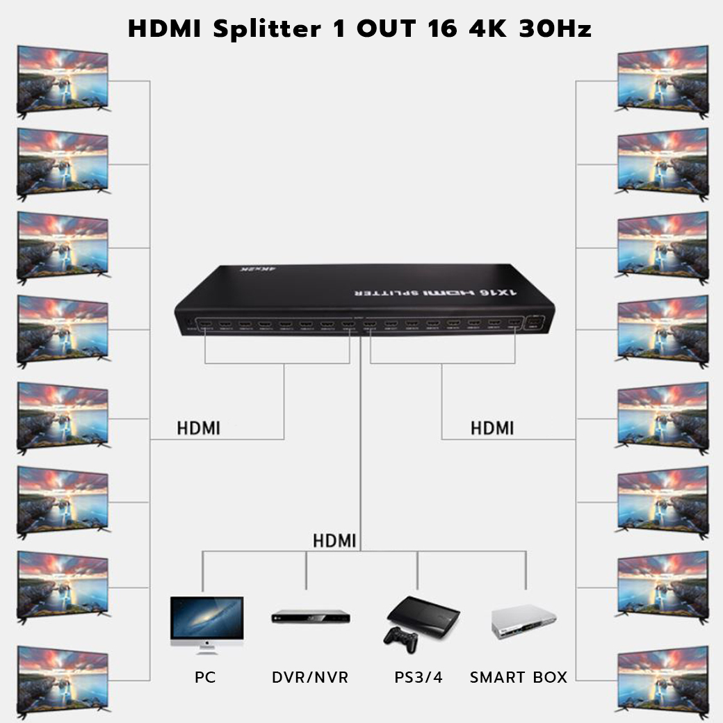HDMI splitter 1ออก16 4K 30Hz เป็นตัวกระจายสัญญาณเสียงและวิดีโอ HD ที่เชื่อมต่อแหล่งสัญญาณ HDMI เข้ากับอินพุตของตัวแยกสัญญาณ