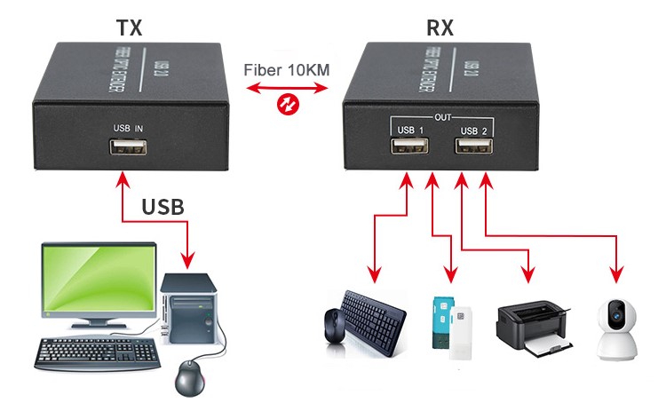 - ส่งสัญญาณวิดีโอ USB 2.0 ได้ไกลถึง 10 กม. ผ่านสายไฟเบอร์ 2. รองรับกล้อง USB เครื่องพิมพ์ ดิสก์ U สแกนเนอร์ หน้าจอสัมผัส และอุปกรณ์อื่นๆ