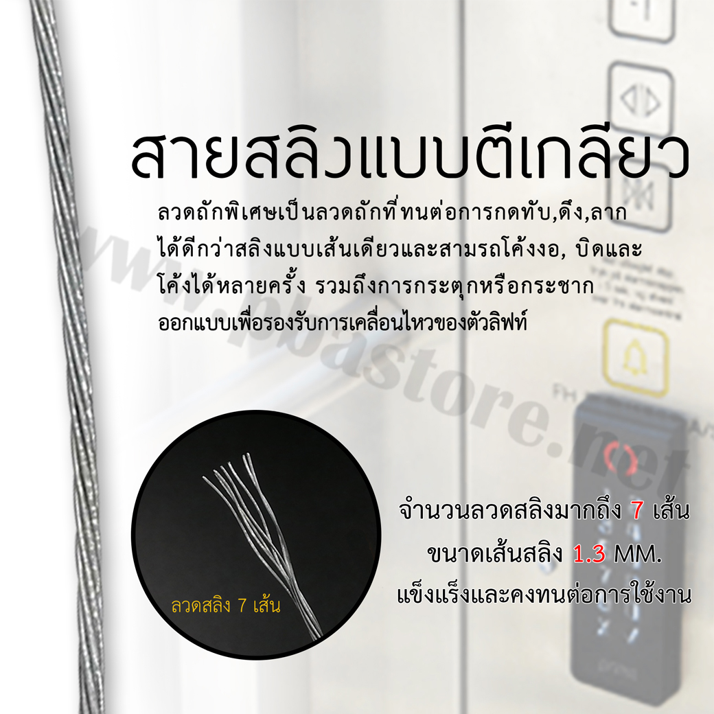 เหมาะสำหรับกล้องวงจรปิดCCTV และWifi สายสลิงแบบตีเกลียวออกแบบมาเพื่อรองรับการเคลื่อนที่ของตัวลิฟต์ สามารถโค้งงอได้ดี ม้วนเป็นวงได้ ทนต่อแรงดึง มีสายกราวด์ในตัวเพิ่มความปลอดภัยของผู้ใช้ลิฟต์และอุปกรณ์