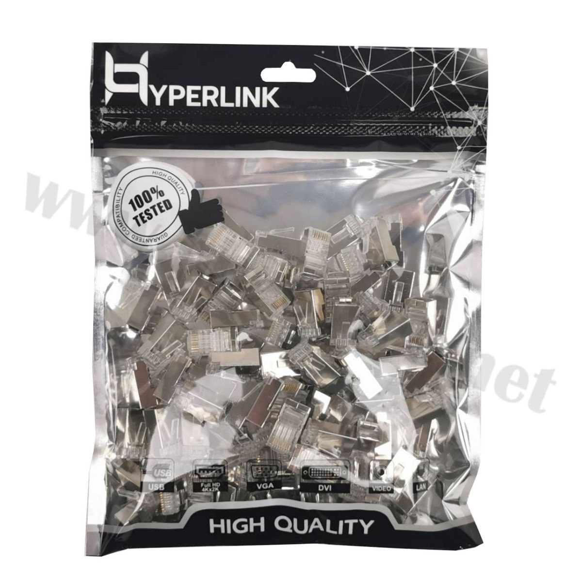 หัวแลน CAT5 หัวเหล็กสีเงิน HYPERLINK ชนิดหัวเหล็ก Shield สีเงิน ใช้สำหรับสายแลน CAT5 หัวแลน แข็งแรง ทนทาน ไม่แตกง่าย