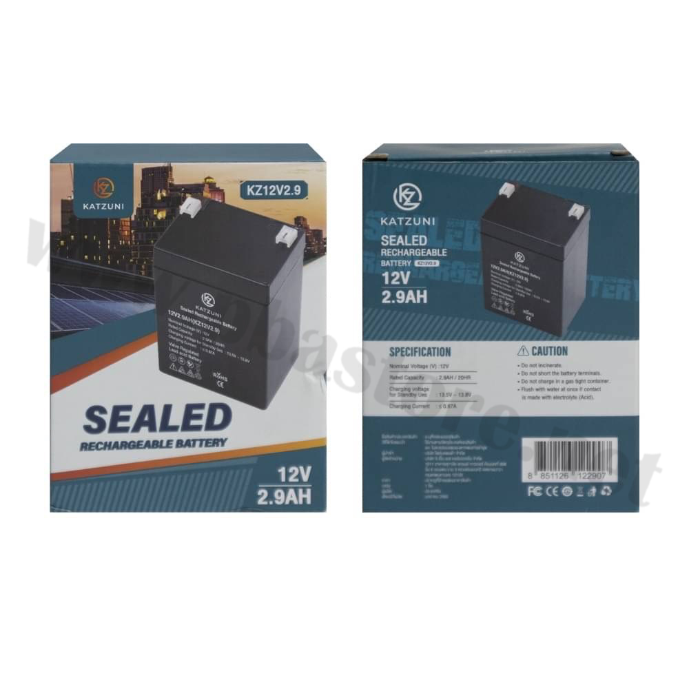 แบตเตอรี่ 12V 2.9AH KATZUNI รุ่น KZ12V2.9AH คืออุปกรณ์กักเก็บพลังงานไฟฟ้า แบตเตอรี่แห้ง นำมาชาร์จไฟใหม่ได้ ไม่ต้องเติมน้ำกลั่น