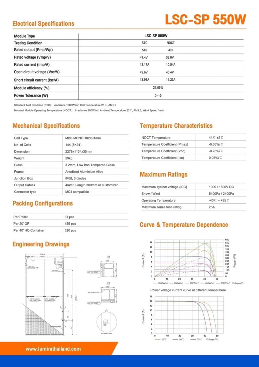 แผงโซล่าเซลล์ 550Watt Lumira รุ่น LSC-SP 550W แผ่นรับพลังงานแสงอาทิตย์ให้เป็นพลังงานไฟฟ้า
