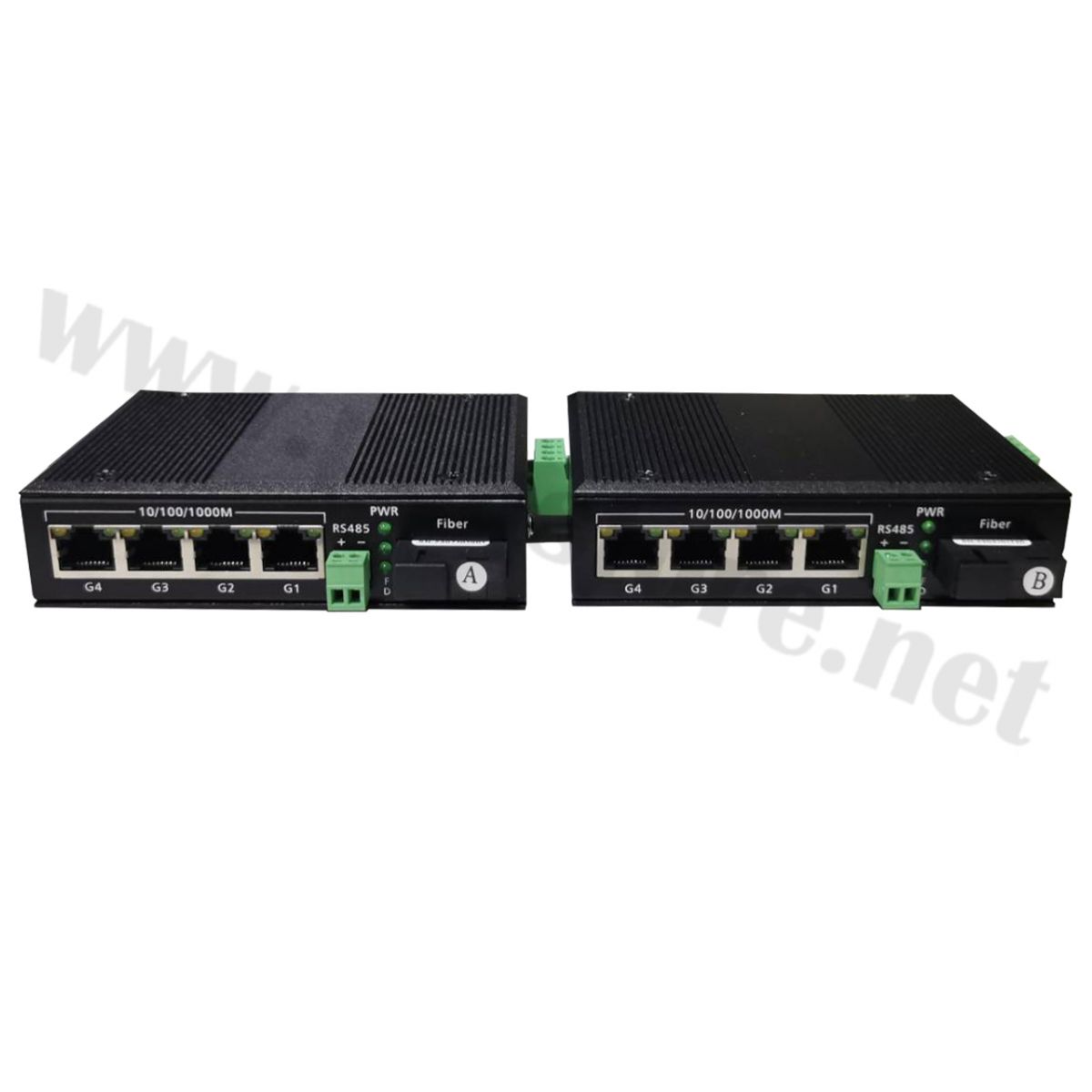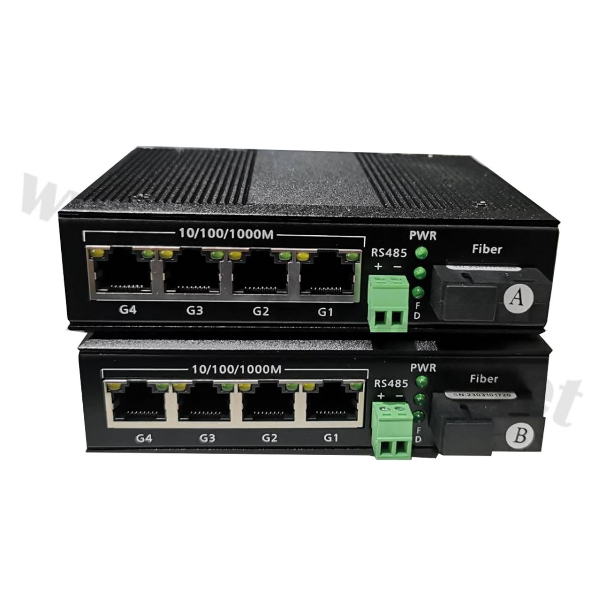 Industrial Media Switch 4 Port with RS485 (2-in-1) 10/100/1000M 20KM (With Power Adapter) เป็นอุปกรณ์เครือข่ายที่รวมฟังก์ชันหลายอย่างในตัวเดียวกันเพื่อให้ความสามารถในการรับส่งข้อมูลระดับ Gigabit Ethernet (4 GE) พร้อมกับ RS485