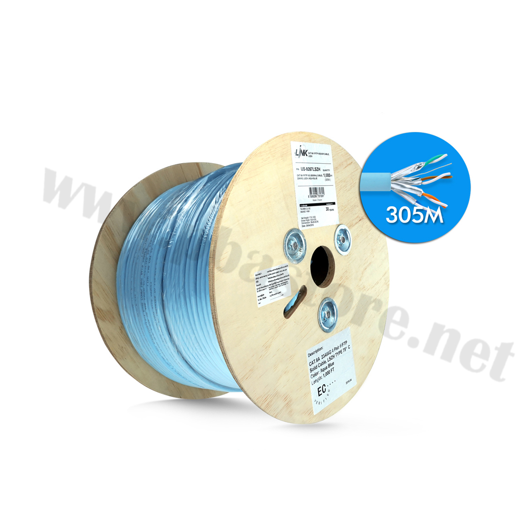 สายแลน CAT6A F/FTP XG ( 500 MHz ) CABLE, LSZH Aqua Blue 305M/ROLL INTERLINK รุ่น US-9267ALSZH เป็นสายภายในอาคาร มี Shield ฟอยล์หุ้มภายในทุกคู่สายแยกจากกัน ป้องกันสัญญาณรบกวน ราคา 6,890.00 .-