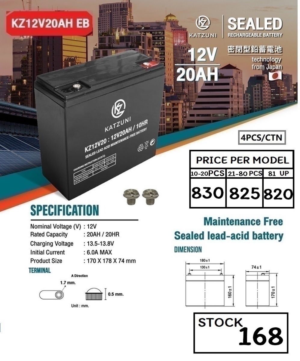 แบตเตอรี่ 12V 20AH KATZUNI KZ12V20AH อุปกรณ์กักเก็บพลังงานไฟฟ้า แบตเตอรี่แห้ง นำมาชาร์จไฟใหม่ได้ ไม่ต้องเติมน้ำกลั่น ราคา 930.00 .-