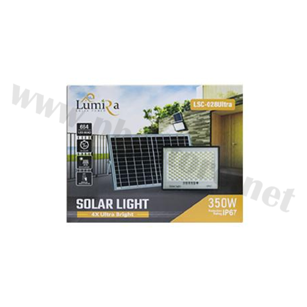 ไฟสปอร์ตไลท์พร้อมแผงโซล่าเซลล์ 350W LUMIRA รุ่น LSC-028 ULTRA 350W ไฟสปอร์ตไลท์พร้อมแผงโซล่าเซลล์ ขนาด 350 วัตต์ ให้ความสว่างสูง ครอบคลุมพื้นที่กว้าง
