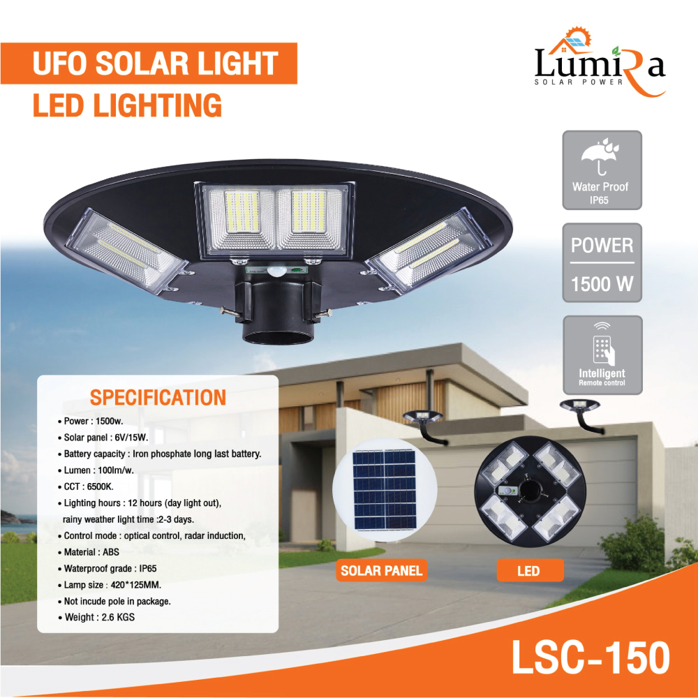 tags: ไฟสนามโซล่าเซลล์, โคมไฟโซล่าเซลล์, ไฟถนนโซล่าเซลล์, Solar Light, UFO Solar Light, ไฟโซล่าเซลล์ 1500W, LUMIRA, LSC-150, ไฟพลังงานแสงอาทิตย์, ไฟกลางแจ้ง, ไฟสนาม, ไฟลานจอดรถ, ไฟโกดัง, ไฟอัตโนมัติ, ไฟกันน้ำ IP65, ไฟ LED โซล่าเซลล์