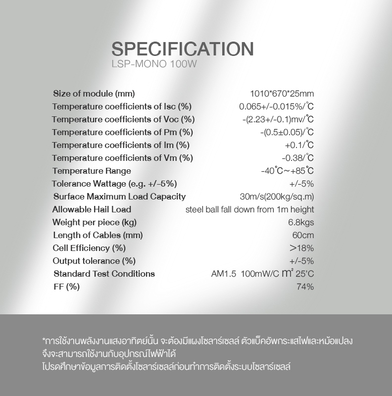 - กำลังไฟสูงสุด: 100 วัตต์ (100Wp)