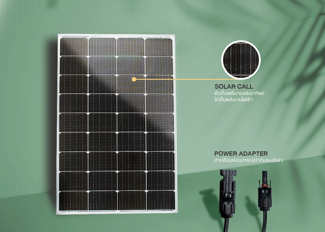 - แรงดันไฟฟ้าวงจรเปิด (Voc): 21.6V