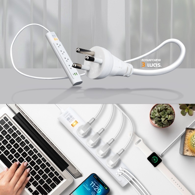 รองรับอุปกรณ์หลากหลายประเภท ไม่ว่าจะเป็นสมาร์ตโฟน แท็บเล็ต หรือเครื่องใช้ไฟฟ้าทั่วไป ตัวสายยาว 3 เมตร ใช้งานได้ไกลขึ้น พร้อมดีไซน์สีขาวเรียบหรู และมาตรฐานความปลอดภัย มอก.