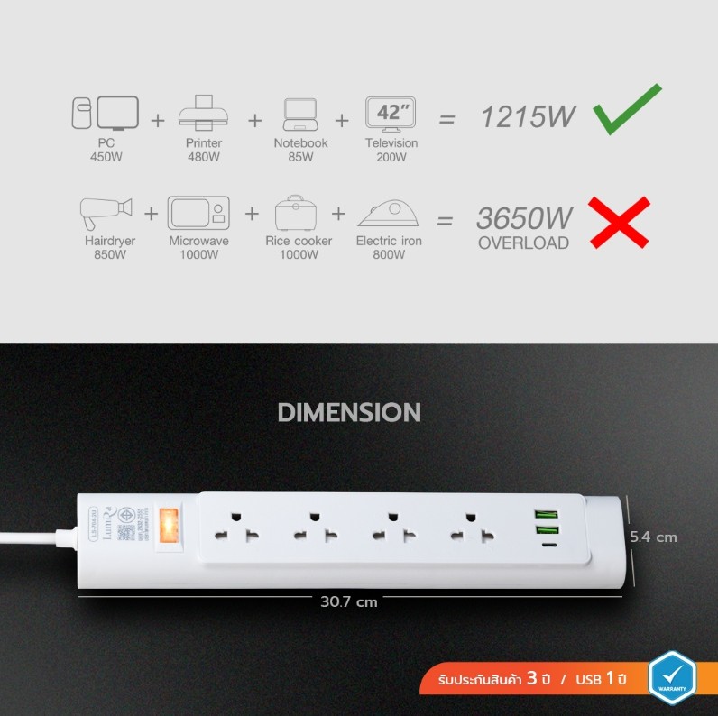 ห้ามเสียบอุปกรณ์ที่มีกำลังไฟรวมเกิน 2,300 วัตต์