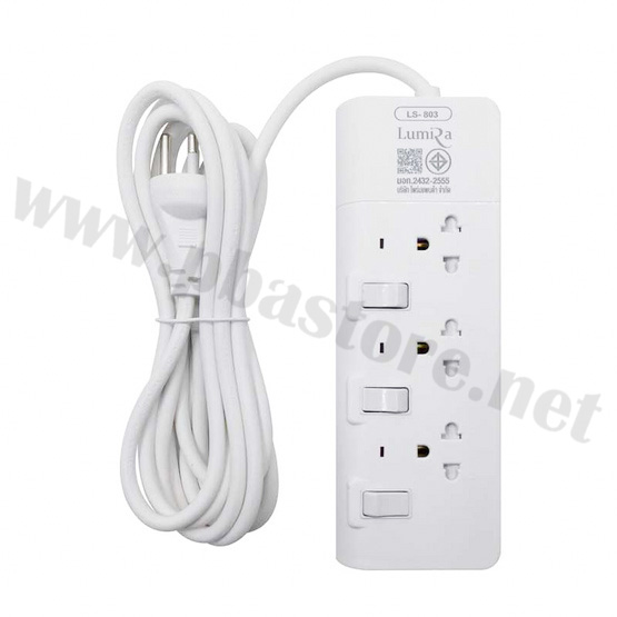 ปลั๊กไฟ 3 ช่อง มีสวิตช์เปิดปิดทุกช่อง สายยาว 5 เมตร สีขาว LUMIRA รุ่น LS-803(5M) (มี มอก.)ปลั๊กไฟคุณภาพสูง มาพร้อม 3 ช่องเสียบไฟฟ้า และ สวิตช์เปิด-ปิดแยกแต่ละช่อง เพื่อความปลอดภัยและประหยัดพลังงาน ราคา 175.00 .-