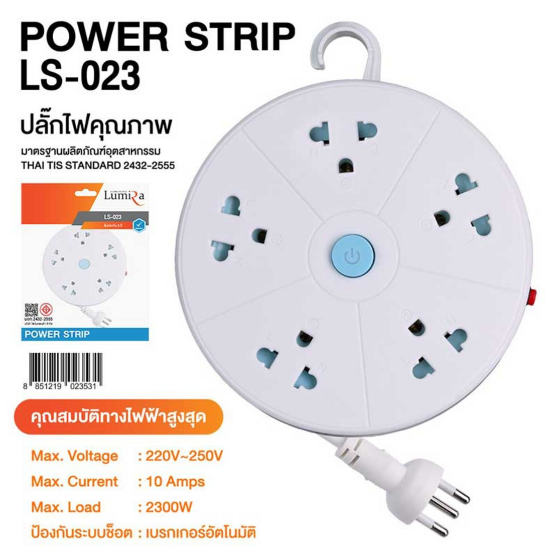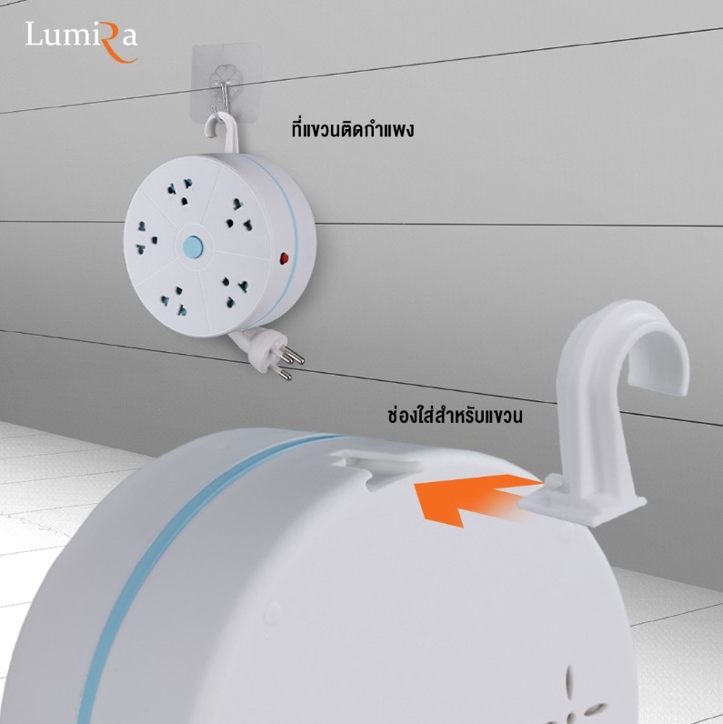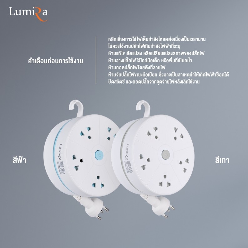 ปลั๊กไฟแบบม้วน 5 ช่อง มีสวิตช์เปิดปิด สายยาว 3 เมตร สีขาว-ฟ้า LUMIRA รุ่น LS-023 3M (มี มอก.) ที่มาพร้อมฟังก์ชันการ ม้วนเก็บสายในตัว ลดความเกะกะของสายไฟ