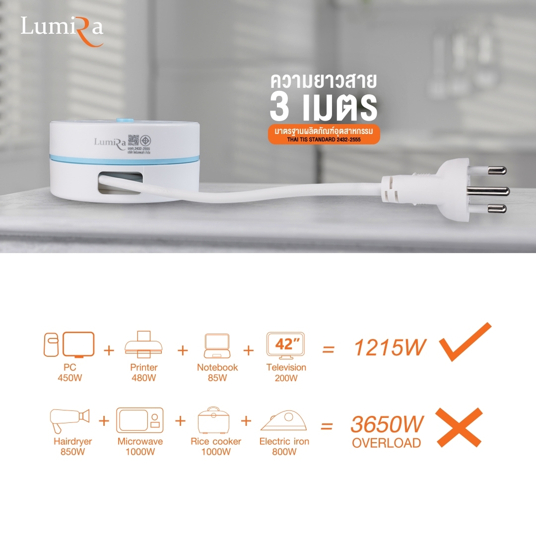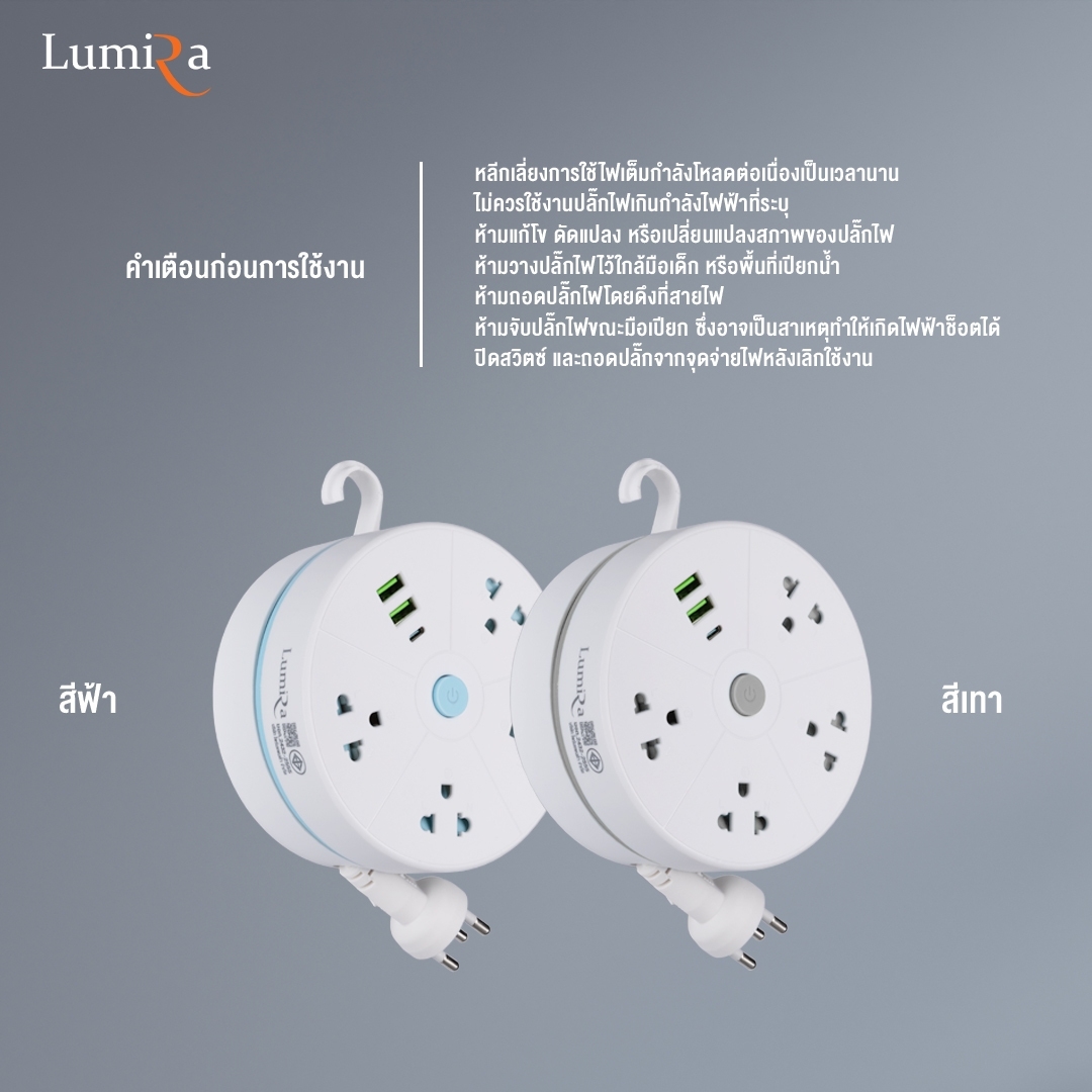 ปลั๊กไฟแบบม้วน 4 ช่อง + USB 2 ช่อง + Type-C 1 ช่อง มีสวิตช์เปิดปิด สายยาว 3 เมตร สีขาว-ฟ้า LUMIRA รุ่น LS-023/2U 3M (มี มอก.)ในยุคที่อุปกรณ์อิเล็กทรอนิกส์และสมาร์ทดีไวซ์กลายเป็นส่วนหนึ่งของชีวิตประจำวัน การเลือกใช้ปลั๊กไฟที่มีความปลอดภัย ใช้งานสะดวก และรองรับการชาร์จอุปกรณ์หลากหลายประเภทจึงเป็นสิ่งสำคัญ