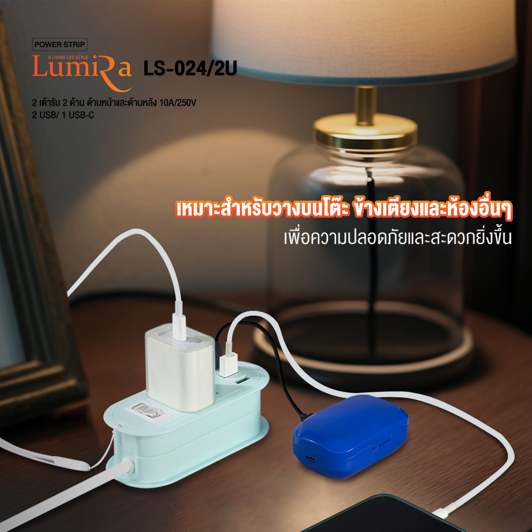 เหมาะกับโต๊ะทำงาน มุมหัวเตียง หรือพกพาไปใช้นอกสถานที่ มาพร้อมฟังก์ชันครบ ทั้งช่องเสียบไฟ, USB 2 ช่อง, และ Type-C ในขนาดเล็กกะทัดรัด พร้อมสวิตช์เปิด-ปิด และสายไฟยาว 1.2 เมตร ปลอดภัย มั่นใจ ด้วยมาตรฐาน มอก.