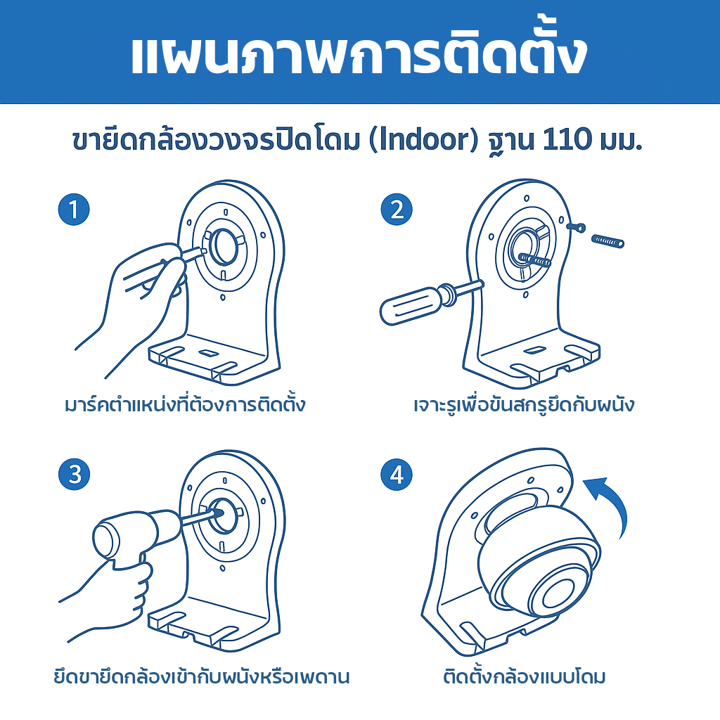 ในการติดตั้งกล้องวงจรปิดให้มีประสิทธิภาพและดูเรียบร้อยนั้น การเลือกใช้อุปกรณ์เสริมอย่าง ขายึดกล้อง ถือเป็นสิ่งสำคัญ โดยเฉพาะกล้องโดม ที่นิยมใช้งานภายในอาคาร ด้วยขนาดที่เล็กกะทัดรัด และรูปลักษณ์ที่สวยงาม ขายึดกล้องที่เหมาะสมจะช่วยให้สามารถติดตั้งกล้องได้มั่นคง ปรับมุมมองได้ตามต้องการ และช่วยซ่อนสายไฟให้ดูเรียบร้อย สำหรับกล้องโดมตัวเล็กที่มี ฐานยึดกว้าง 110 มม. จำเป็นต้องเลือกขายึดที่มีขนาดและรูยึดตรงกัน เพื่อความพอดีและความปลอดภัยในการใช้งาน