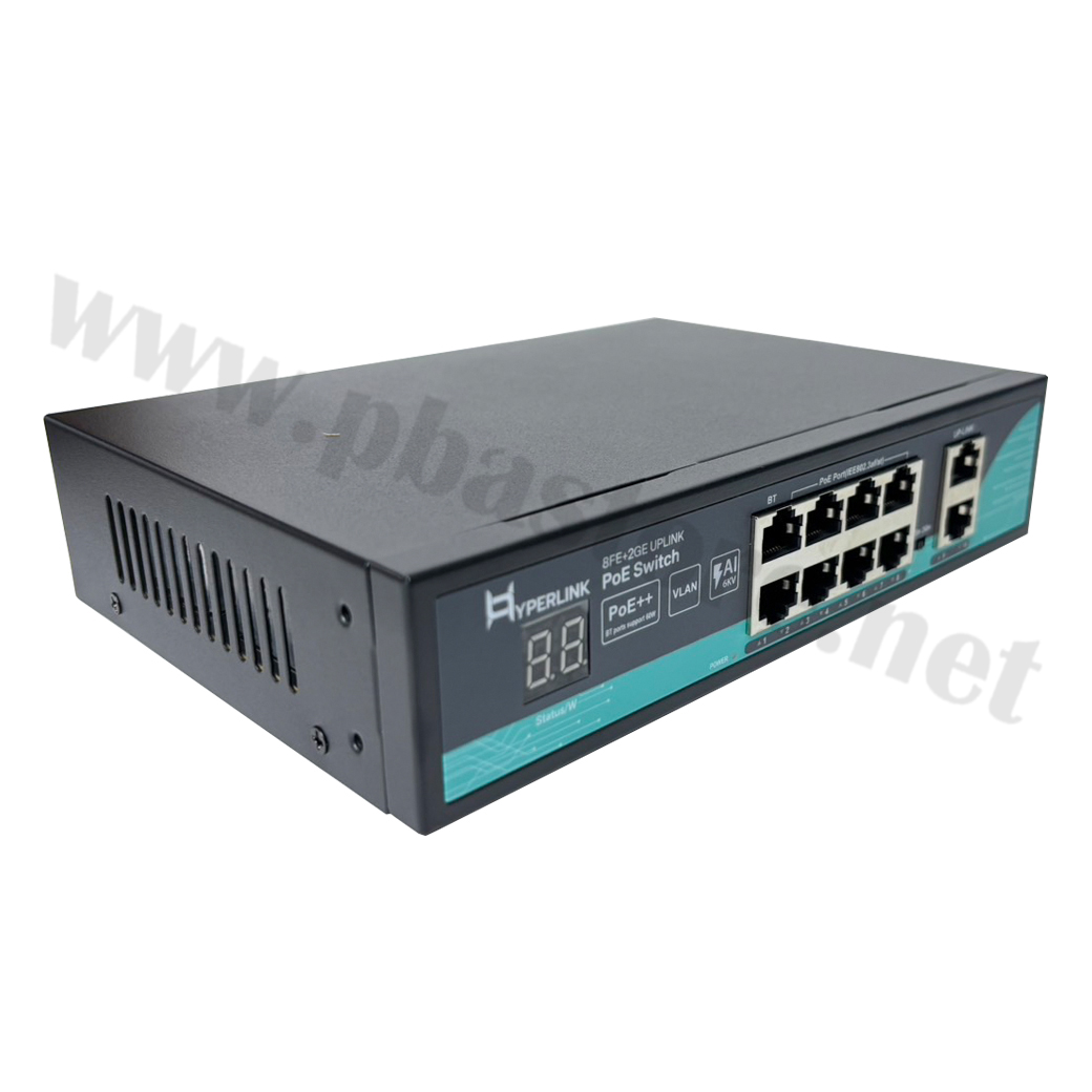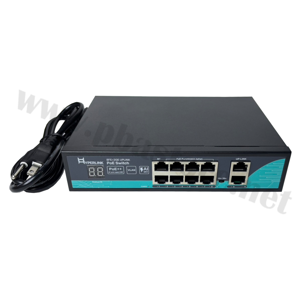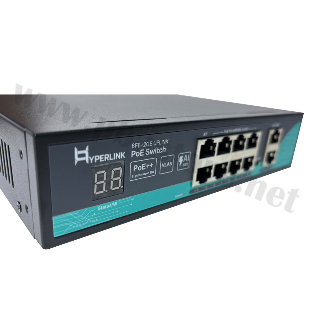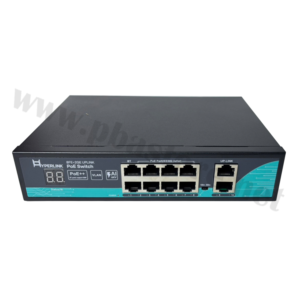 POE++ SWITCH 8CH 10/100M + 2LAN Uplink 10/100/1000M AF/AT/BT First Port up to 60W / VLAN With AI Surge protection 6KV Hyperlink รุ่น HOR-SL82P-V2 เป็น PoE++ Switch ขนาด 8 พอร์ต (10/100Mbps) พร้อมพอร์ตอัปลิงก์ 2 พอร์ต (10/100/1000Mbps)