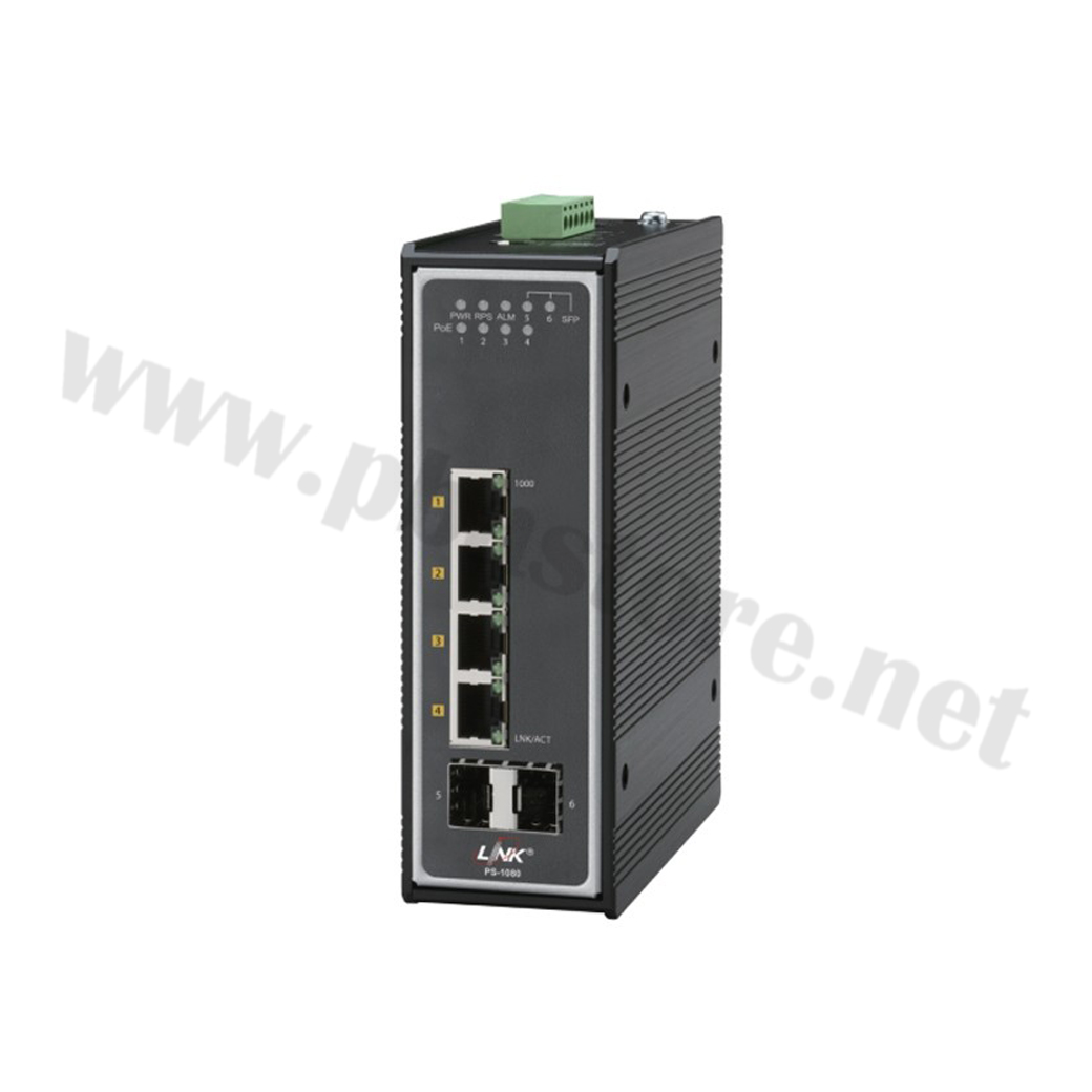 Industrial PoE+ Switch, 4-Port 10/100/1000Base-T PoE/PoE+(120W) with 2-Port Gigabit SFP Uplink INTERLINK รุ่น PS-2080 ถูกออกแบบมาเพื่อใช้งานในสภาพแวดล้อมที่รุนแรง รองรับการจ่ายไฟผ่านสายแลน (PoE/PoE+) ทั้งหมด 4 พอร์ต พร้อมด้วยพอร์ต SFP Uplink แบบกิกะบิตอีก 2 พอร์ต