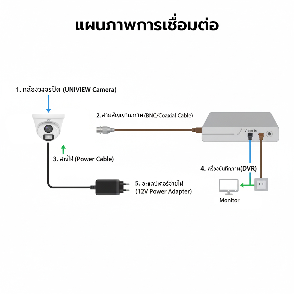 2.ต่อสายสัญญาณวิดีโอและสายไฟ DC 12V เข้ากับกล้อง