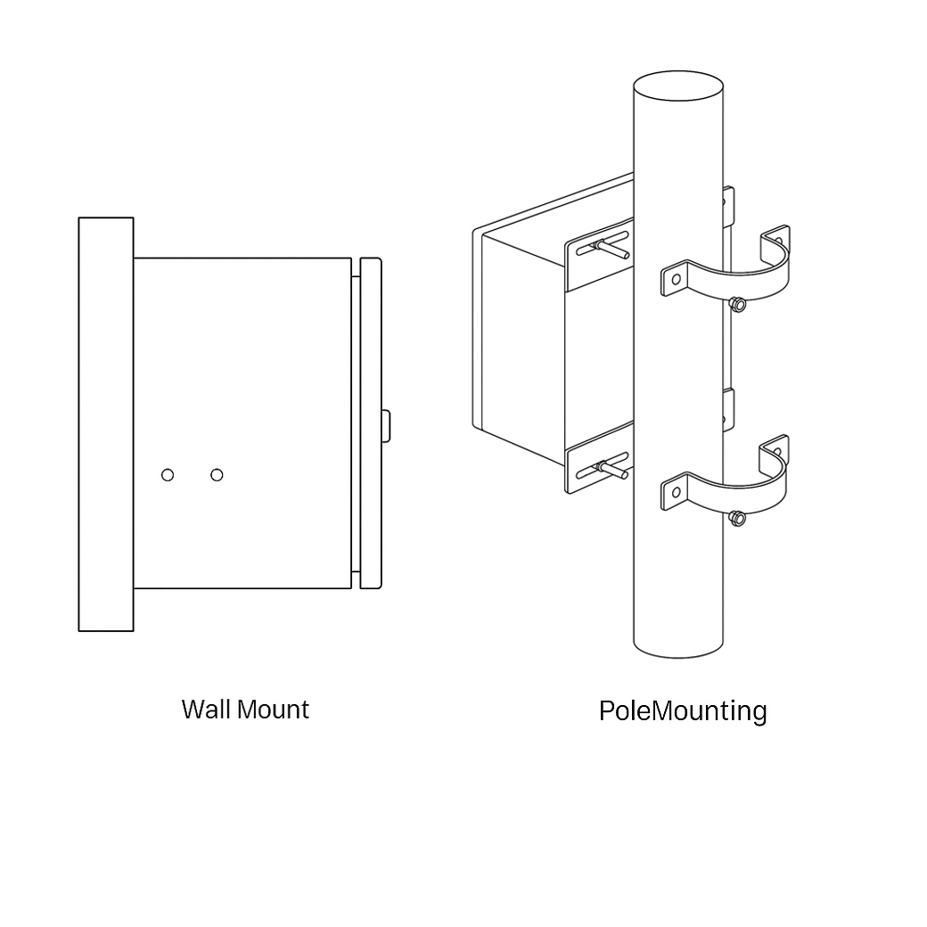 1.ติดตั้งตู้ในตำแหน่งที่ต้องการ (ผนังหรือเสา) โดยให้สายไฟและสายสัญญาณเข้าทางด้านล่างเพื่อป้องกันน้ำเข้า