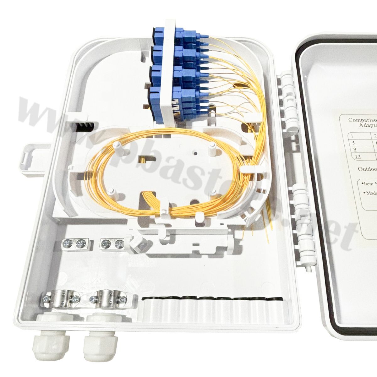 กล่องเก็บสายไฟเบอร์สำเร็ปรูป 16Core Simplex SCUPC พร้อมอุปกรณ์ Adapter With Pigtail Distribution Box Outdoor กันน้ำ ออกแบบมาเพื่อใช้เป็นจุดรวมและกระจายสัญญาณในระบบ FTTH/FTTx รองรับการติดตั้ง Adapter และ Pigtail ภายในกล่องเดียว ตัวกล่องมีคุณสมบัติกันน้ำ กันฝุ่น