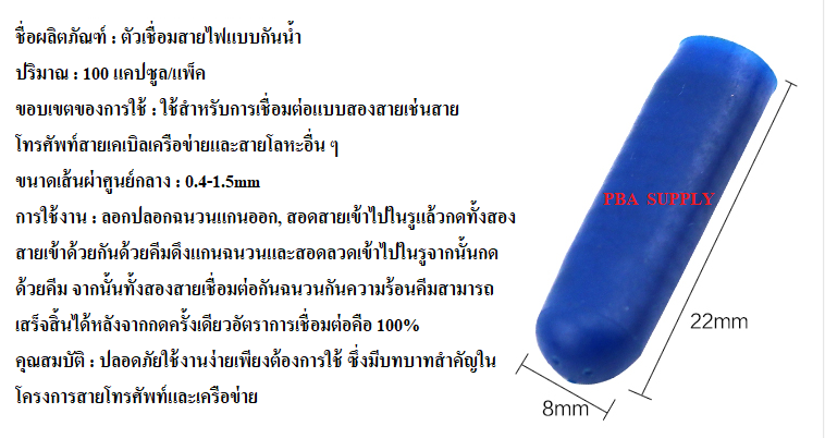 ขั่วเชื่อมสายกันน้ำ สีฟ้าแบบบีบเชื่อมคุณภาพสูง เชื่อมสายนำสัญญาณเคเบิล LAN และ สายสายโทรศัพท์ สายไฟPVC มีเจลเย็นด้านใน รองรับขนาดสาย 0.4-1.5mm ราคา 1.50 .-